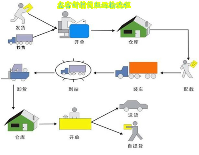 1:客戶將貨物送到公司或者由鑫富公司派車外出上門接貨 →2:開單(貨物到達鑫富公司后,對貨物的具體數量,重量,體積,包裝開具貨物托運單)→3入庫(開好托運單后,倉庫對貨物進行分類,場地擺放,貼上標簽,做好標識,區分。)→4:配載(貨物裝車,裝車工根據貨物的輕重,大小,數量的多少,以及包裝對貨物進行車輛碼放配載,)→5:到站(車輛到達目的地倉庫,入庫,單據交接)→6:卸貨(車輛到達目的地倉庫后,卸貨工人根據貨物多少,大小,輕重,配送目的地距離遠近進行貨物卸載,分類)→7:開單:(單據核對,根據客戶要求以及貨物多少對貨物進行配送或者通知客戶取貨)