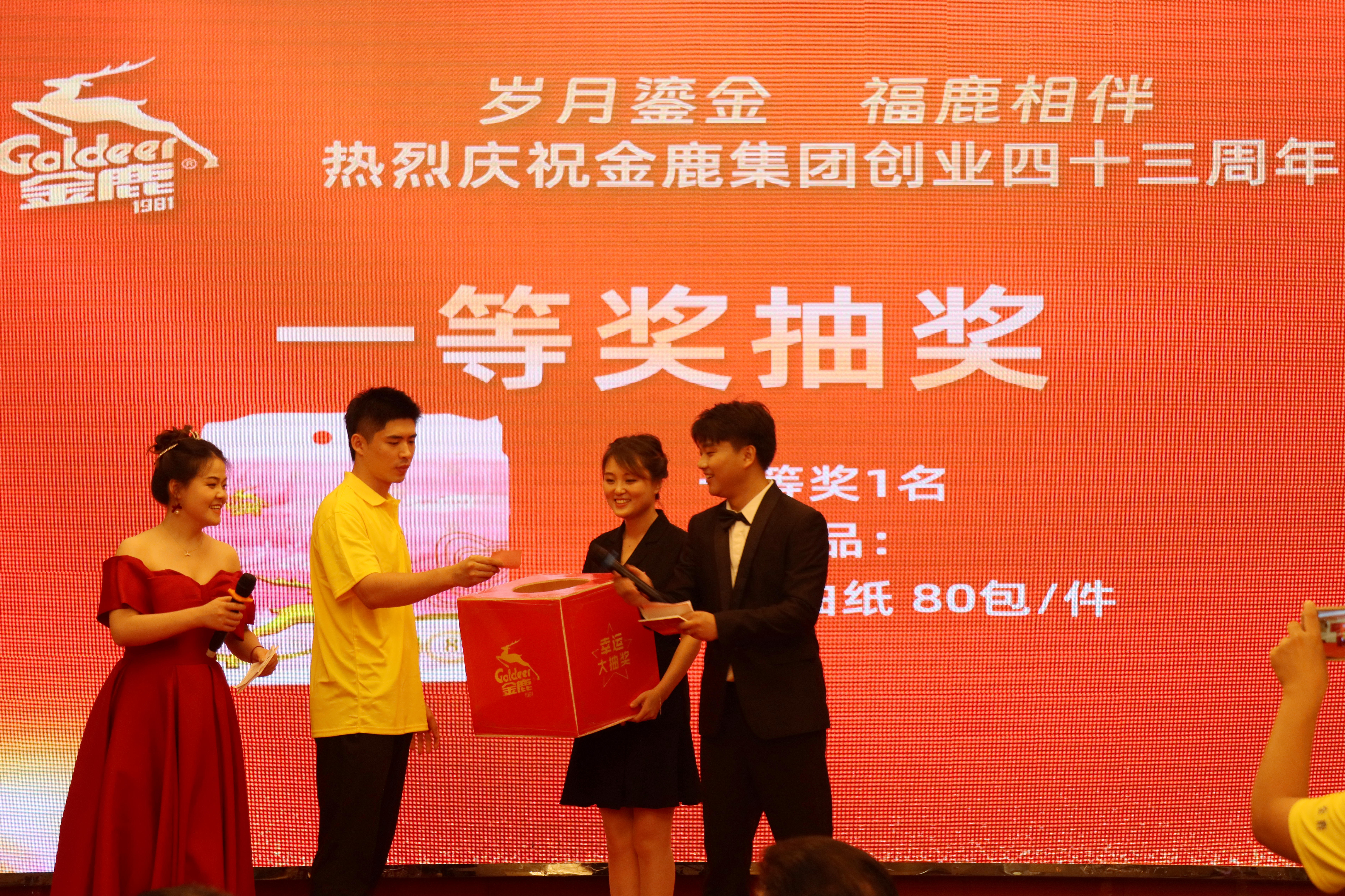 8月1日晚上,金鹿集團在金鹿大酒店十樓宴會廳舉行了廠慶晚宴活動。晚宴上,頒發知識競賽和技能競賽各個獎項,以表彰在活動中表現突出的員工和團隊。此外,晚宴上還呈現了精彩的文藝表演和幸運抽獎等環節,讓員工在輕松愉快的氛圍中享受廠慶的喜悅。